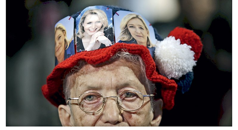 Сторонник Национального фронта в головном уборе с портретами Марин Ле Пен и Марион Марешаль-Ле Пен, Франция, Марсель, 9 декабря 2015 года