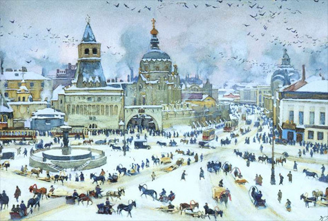 © ГТГ Константин Юон. Лубянская площадь зимой. 1905 В центре Лубянской площади в Москве, где в советское время находился памятник Феликсу Дзержинскому, будет установлен фонтан. До 1934 года на этом месте был расположен фонтан работы скульптора Ивана Витали.