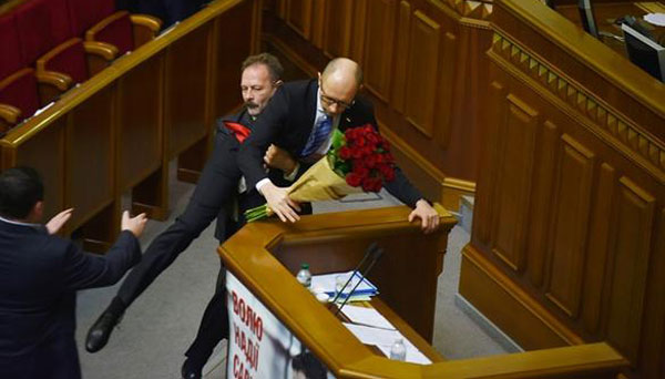 Олег Барна и Арсений Яценюк. Фото: kp.ua Как бы то ни было, в последние дни агрессия в украинской политике и правда все чаще выплескивается в публичные акции сомнительного свойства. 11 декабря на заседании Верховной рады произошла потасовка между депутатами от «Народного фронта» и «Блока Петра Порошенко». В парламенте обсуждали отставку правительства. Депутат Олег Барна из президентской партии подошел к трибуне и подарил Яценюку букет красных роз, после чего схватил его и вынес из-за трибуны. После этого между парламентариями развязалась драка.