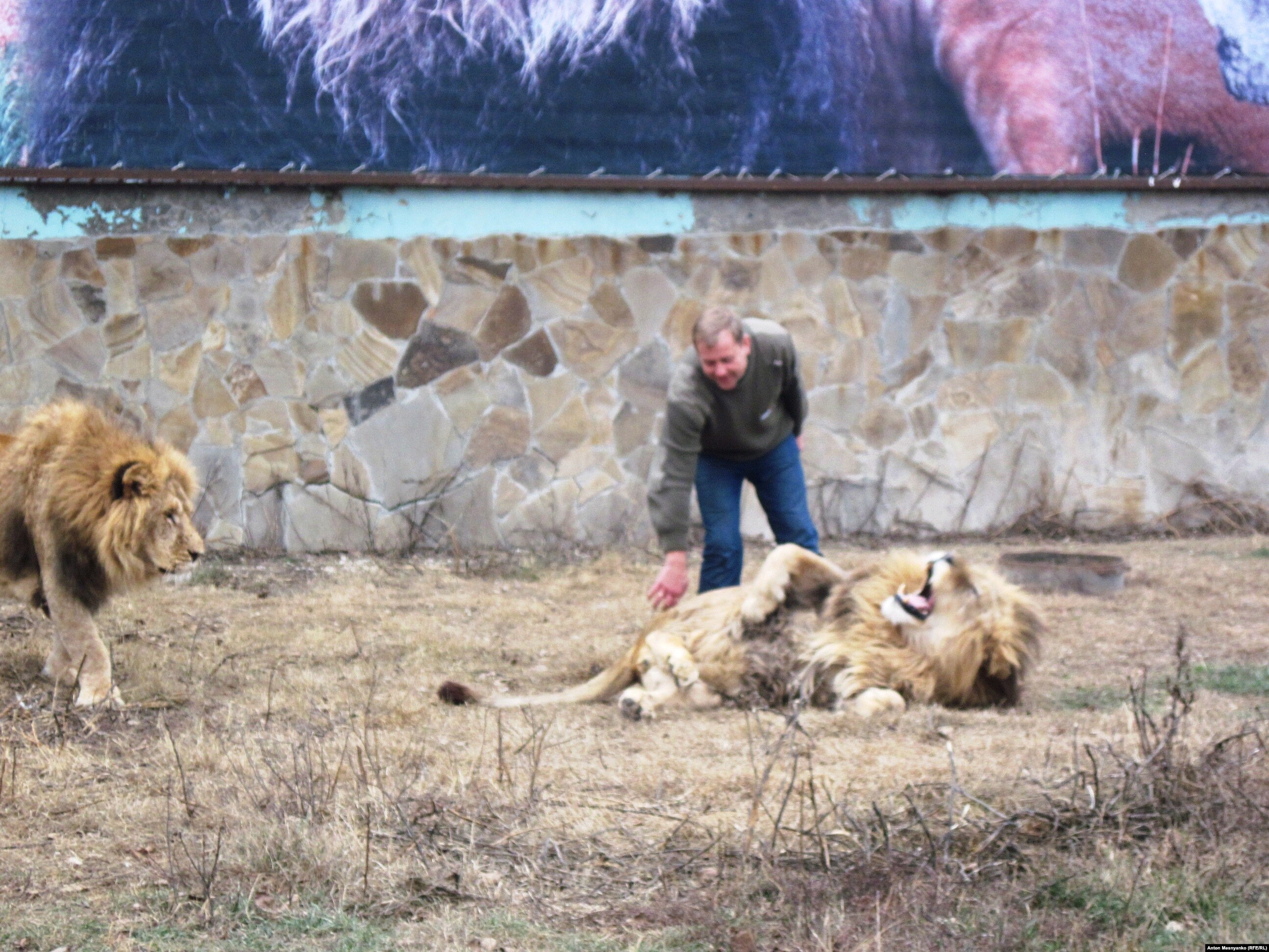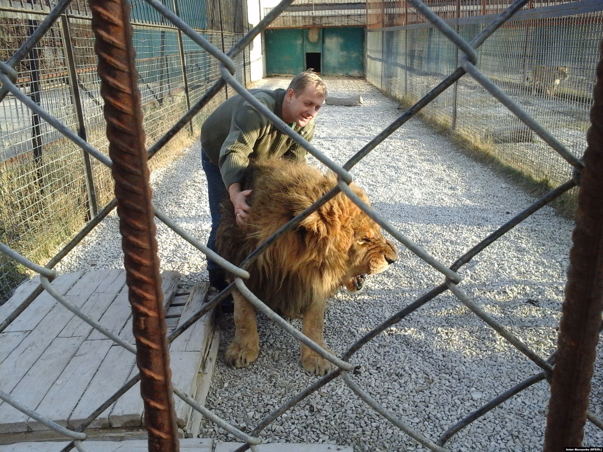 Олег Зубков подходит к решетчатой дверце, открывает замок и заходит внутрь вольера. Ему навстречу несется огромный лев. Подбежав к человеку, 300-килограммовый хищник словно превращается в котенка: трется о ногу, мурлычет и валится на спину, просит, чтобы ему почесали живот. История повторяется во втором и третьем вольерах. "Мои хорошие! Папе некогда вами заняться. Папа войной занят", – приговаривает Зубков, трепля животных по холке.
