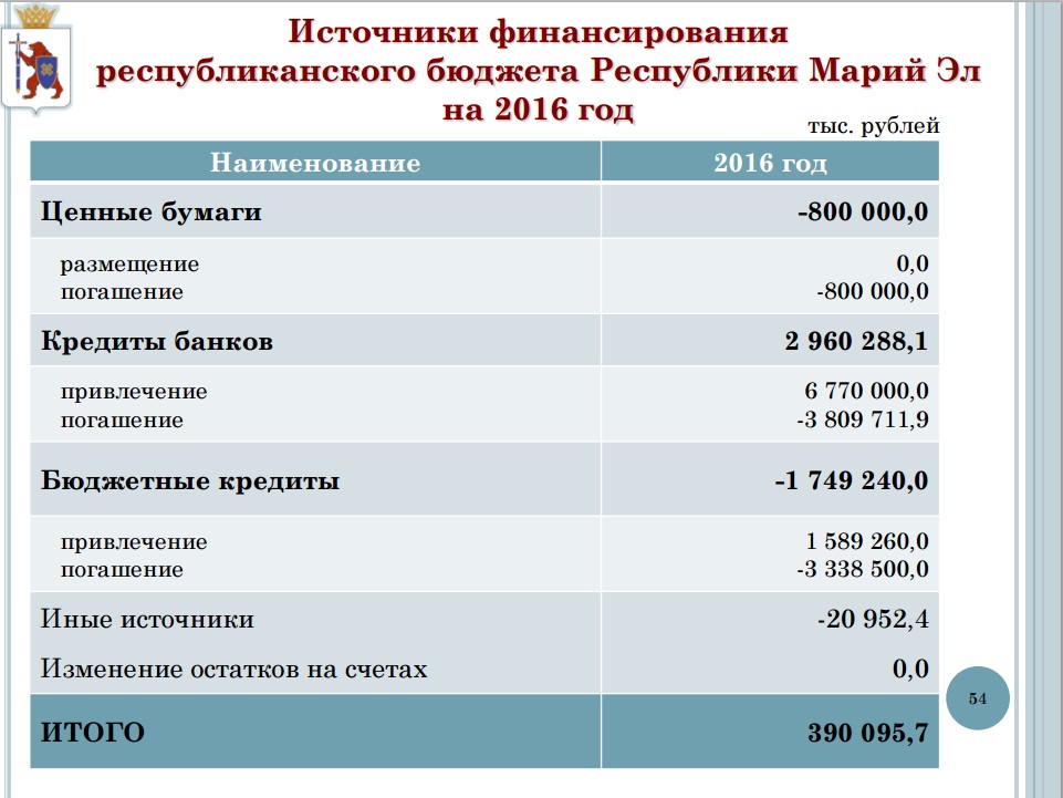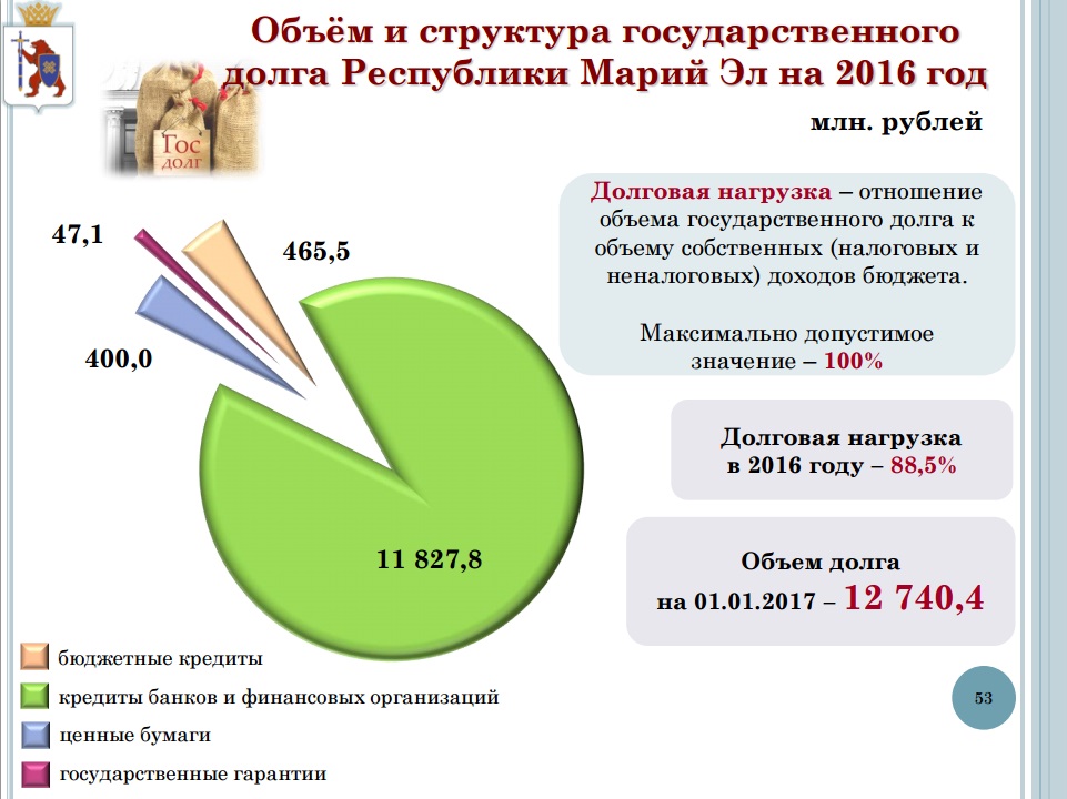 Размещенная на странице Министерства финансов Республики Марий Эл брошюра «Бюджет для граждан» впервые детально описывает структуру государственного долга республики. Общий его объем через год, к 1 января 2017 года, составит 12 млрд 740,4 млн рублей. Уровень долговой нагрузки (отношения объема госдолга к объему собственных налоговых доходов) в течение следующего года достигнет 88,5%. Впервые республиканский Минфин подробно описал структуру государственного долга республики. 11 млрд 827,8 млн рублей (92,8% от общей суммы) составляют кредиты коммерческих банков и финансовых организаций. Доля бюджетных кредитов, привлеченных республикой, несопоставимо меньше — 465,5 млн рублей — 3,65%. Кроме того, госдолг республики формируется также и за счет выпуска ценных бумаг (400 млн рублей) и предоставления государственных гарантий (47,1 млн рублей).