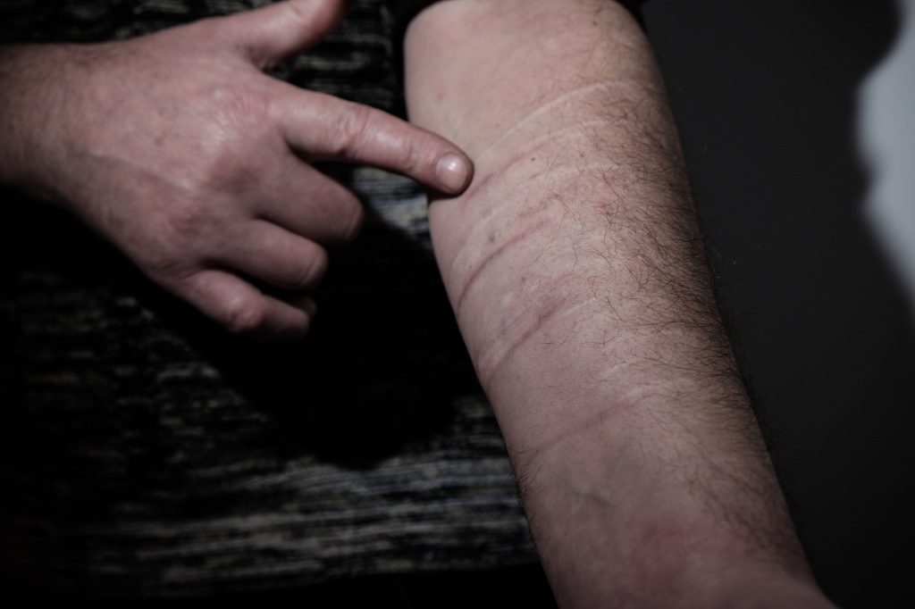 Потом я снова написал и нелегально жалобу отправил. В 2013 году приезжала следователь Наумова. Она не стала искать, кто и почему это сделал, а стала уточнять у меня, откуда у меня появилось лезвие — потому что меня когда били, я перерезал себе руки, чтобы сознание потерять. Потому что точечная боль идет, они же бьют в почки, в печень. Двое стоят по сторонам, я вот так зажался, чтобы не повредили голову, они мне ноги отбили. Они у меня были как галифе, просто вздутые, фиолетовые.