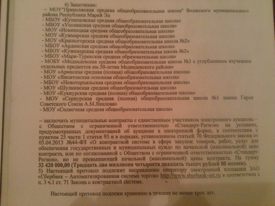 29 апреля 2015 года Министерство образования и науки Марий Эл объявило совместный аукцион в электронной форме (извещение №0308300038615000003) на поставку 20 школьных автобусов для 17 образовательных учреждений республики. Государственный (муниципальный) контракт на сумму в 32 миллиона 420 тысяч рублей был заключен с ООО “Стандарт Регион”.