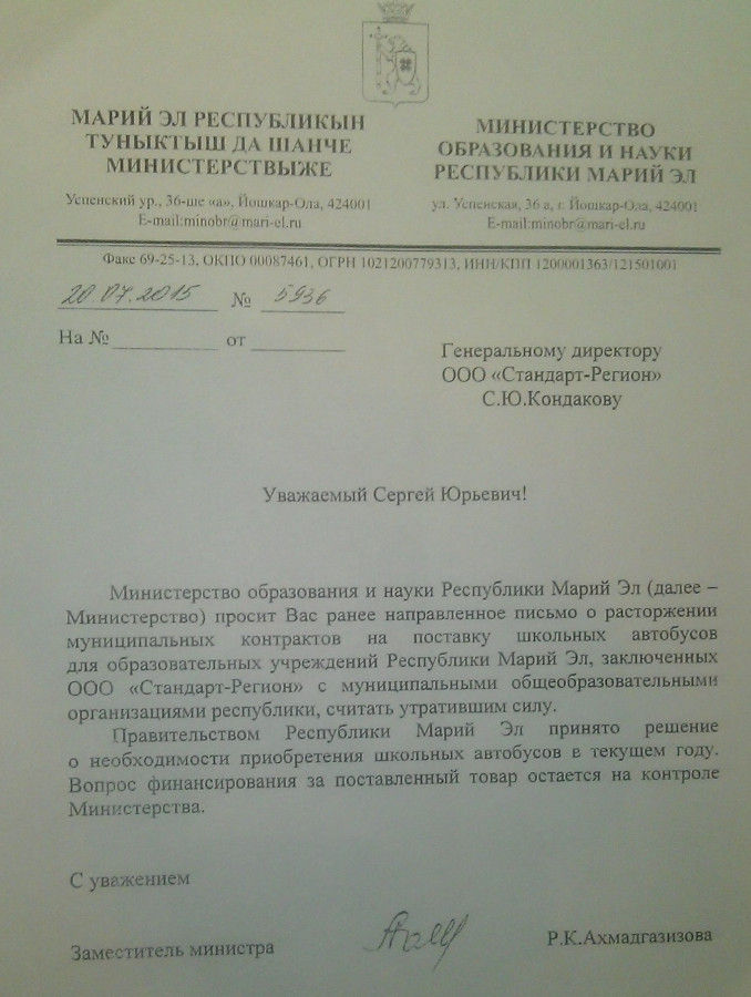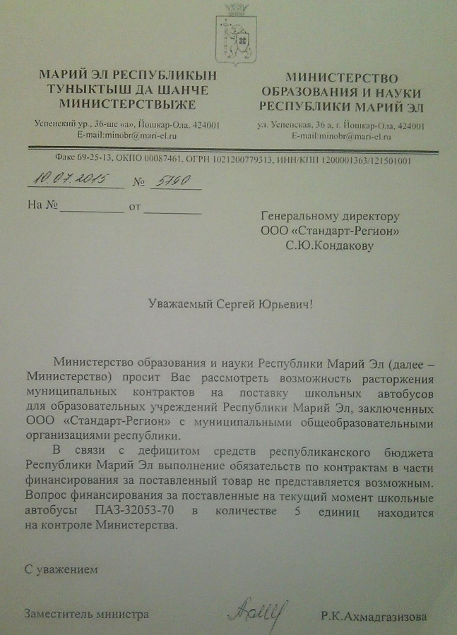 Заместитель министра образования и науки Марий Эл Р.К. Ахмадгазизова направила генеральному директору ООО “Стандарт-Регион” письмо с просьбой расторжения государственных (муниципальных) контрактов на поставку школьных автобусов в связи с невозможностью оплаты транспорта из-за дефицита бюджета республики.