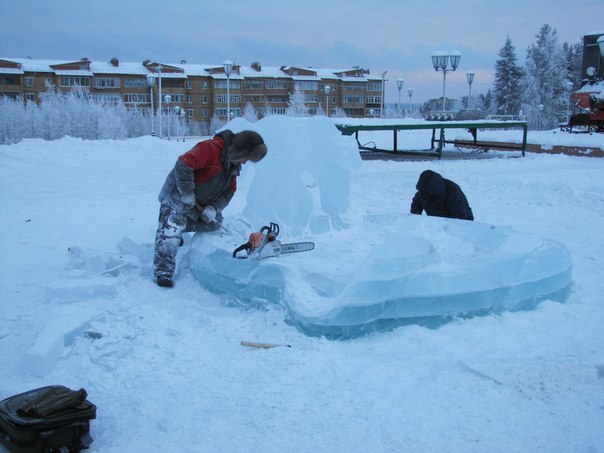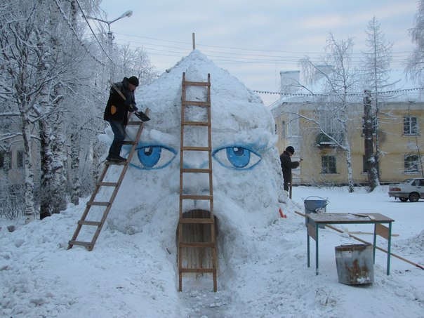 На площади у Дома Детского Творчества (ДДТ) в железнодорожной части города уже несколько дней радует глаз, но стоИт одиноко, высокая ель. Здесь же снежные скульпторы, несмотря на морозец и метель, ваяют детскую горку в виде головы дядьки Черномора. Оригинально. Рядом два высоких деревянных короба, заполненные до самого верху снегом – наверно это будущие Дед Мороз и Снегурочка. Тут надо бы поторопиться, а то осталось всего-то чуть больше недели до боя Курантов.