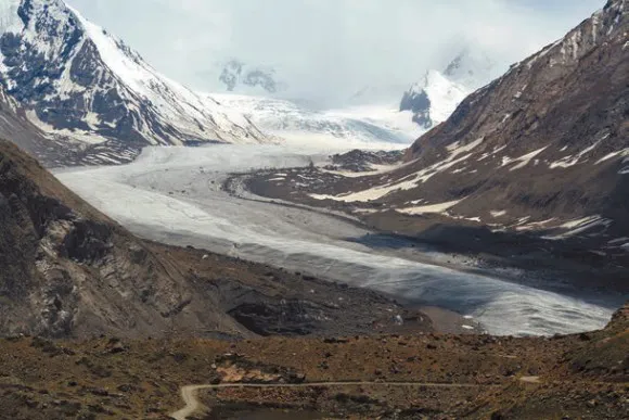 Сразу за перевалом дорога крутым серпантином спускается к истокам реки Дода (или Дод, Stod River), общая длина которой составляет 79 км. Вскоре мы увидели впечатляющую двадцатикилометровую ленту ледника Даранг (Drang Drung или Durung Drung Glacier) и вершину Z3, из-под которой он «вытекает». Нижняя часть этого ледника, крупнейшего в Ладаке, выходит к речной долине широким языком, разбитым трещинами и засыпанным сверху щебнем и валунами. Под ледником лежат два небольших озера — одно серое, другое синее. Из них и вытекает бурливая Дода, один из главных истоков реки Занскар.
