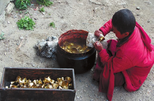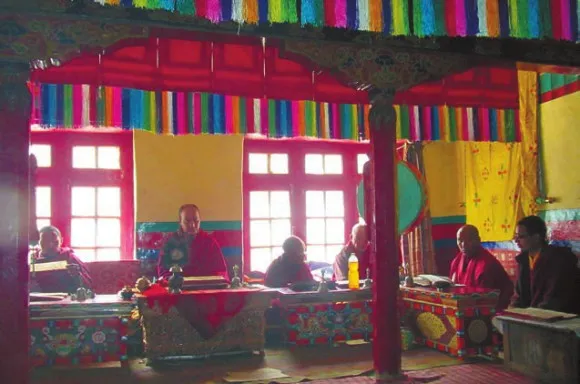 В монастыре было много молодых послушников в бордовых одеяниях. Они мыли посуду, мели полы, чистили лампады. Их учителя-ламы собрались наверху в общем храмовом помещении (дукханге) и были заняты совместной молитвой. Нам разрешили пройти мимо них. Ламам явно было не до разговоров с нами, они поглядывали в свои священные тексты и речитативом бубнили, не обращая внимания на неожиданно появившихся пришельцев.