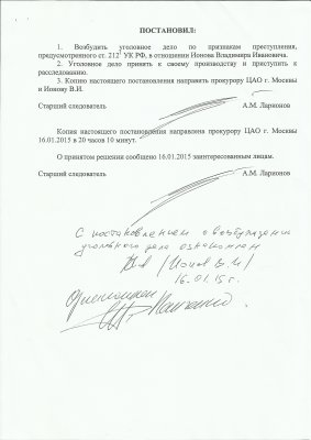 В основу обоих дел легли постановления о нарушениях на четырех мероприятиях: 6 августа и 5 декабря 2014 года у Гальперина и 13 и 14 сентября 2014 года — у Ионова, а также упоминавшиеся выше акции 10 и 15 января 2015 года, постановления по которым, вынесенные 16 января, еще даже не были обжалованы (это можно сделать в течение десяти дней). «Они уже в постановлении о возбуждении уголовного дела указывают, что Тверским судом он был привлечен к административной ответственности, — возмущался адвокат Сергей Панченко, первые дни представлявший интересы Ионова. — Указывают на не вступившие в законную силу решения, как на свершившийся факт». В июле выяснилось, что, что из дела Ионова вычеркнули оба сентябрьских эпизода, добавив протоколы о более поздних, уже весенних задержаниях.