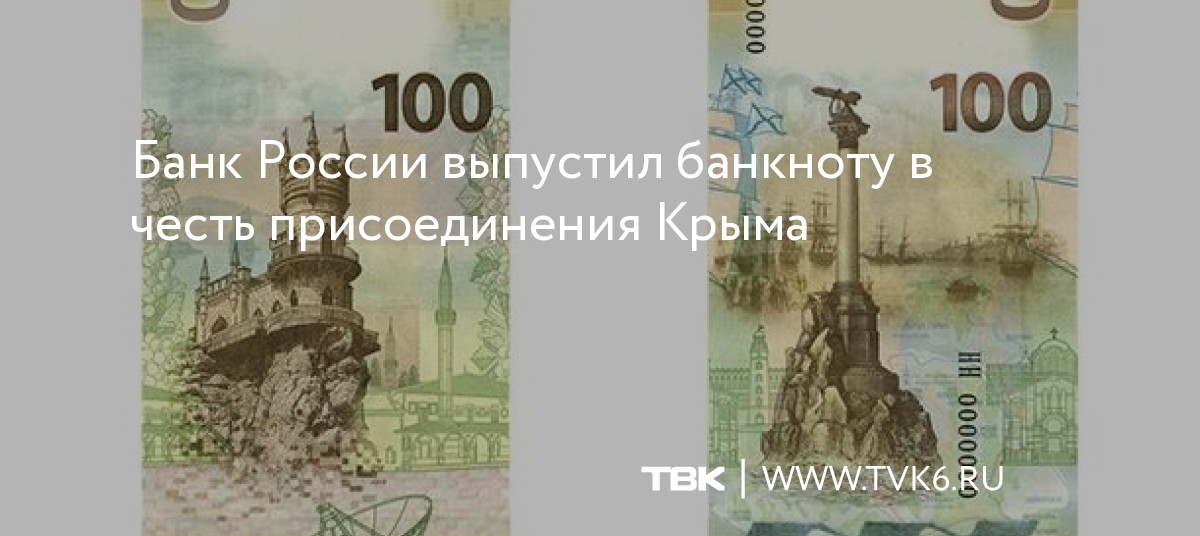 «На стороне банкноты, посвящённой Крыму, изображен замок “Ласточкино гнездо”. На другой стороне – Памятник затопленным кораблям в Севастопольской бухте, фрагмент картины И. К. Айвазовского “Русская эскадра на Севастопольском рейде”. Оба изображения ориентированы вертикально», – говорится в сообщении Банка России.
