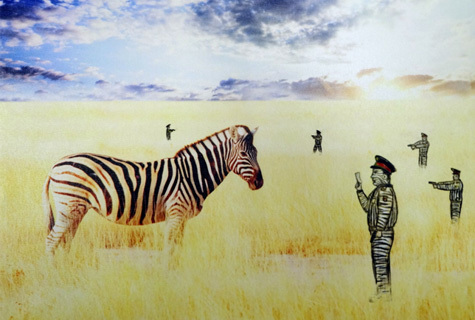 © Айдар Бекчинтаев Айдар Бекчинтаев. Без названия («Полицейские под прикрытием зачитывают зебре её права, которых не особенно и много»). 2015 (фрагмент) В воскресенье, 27 декабря, в Петербурге состоится передвижная антивоенная выставка «НЕ МИР», на которой будут представлены работы художников из России, Украины, Финляндии, Германии и Австрии.
