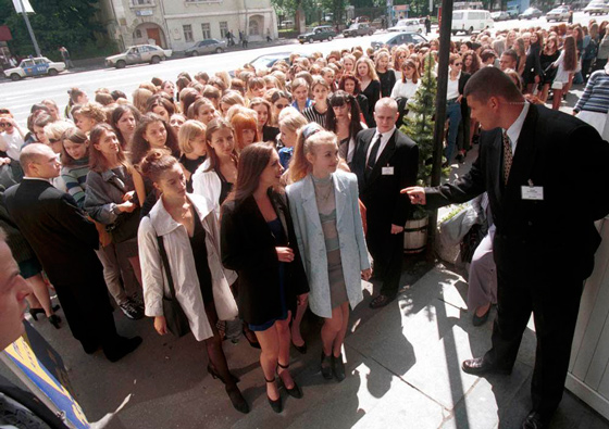 © Евгений Кондаков Очередь на кастинг в модельное агентство. Кажется, что красивых девушек явно больше, чем товаров, которые нужно рекламировать, 1999 г. В 1990-е я также сотрудничал с журналом «Андрей» — одним из первых русских мужских журналов. Журнал «Андрей» придумал один человек — Алексей Вейцлер. Он был главным редактором, фотографом и продюсером. Сам находил моделей, писал тексты и верстал журнал в своей квартире у метро «Южная». С Вейцлером мы познакомились на какой-то презентации, их было много в 1990-е. Помню, одна из первых съемок происходила на фоне стены из компьютеров, которые журналу выдала какая-то коммерческая фирма. Съемки происходили в примитивных студиях, в обычных комнатах и подвалах — где придется. Снимали как-то даже в настоящей пожарной части.