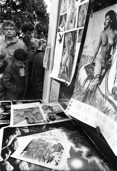 © Евгений Кондаков Торговля первым эротическим самиздатом на улицах Москвы, 1990 г. Моделями были студентки, секретарши и продавщицы, которым хотелось изменить свою жизнь и попробовать что-то новое. Они пытались через откровенные фотосессии попасть в другой мир — глянцевый, красивый. Чаще всего для них это была первая и единственная съемка в жизни. Денег им не платили. Многие из них считали, что такие съемки — это круто и прогрессивно. Таким образом они отбрасывали старые принципы морали.