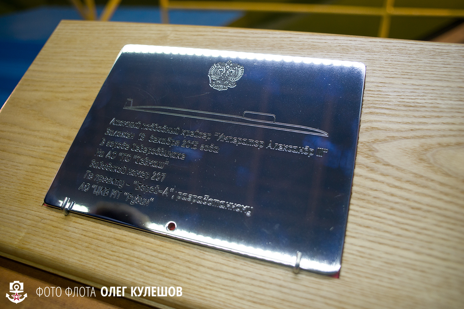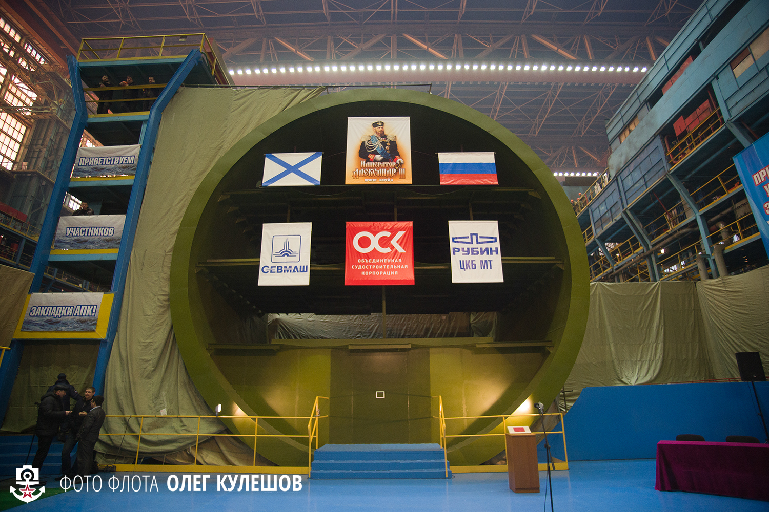 По традиции, на закладной секции подводной лодки вывесили Военно-морской и государственный флаги России, а также баннеры с фирменными логотипами разработчиков и строителей крейсера — ЦКБ "Рубин", предприятия "Севмаш" и Объединенной судостроительной корпорации России. Венчает эту "галерею" портрет императора Всероссийского Александра III — того, чьим именем и назван новый ракетоносец.