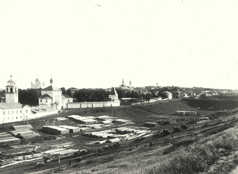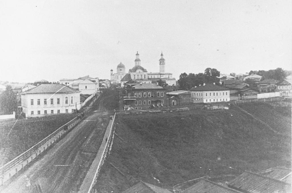 В этом квартале по сведениям архитектора А. Г. Тинского в 1875 г. за мещанкой Александрой Голомидовой числились двухэтажный деревянный дом на каменном фундаменте и деревянный флигель. Усадьба постепенно расширялась внутрь квартала и своими границами выходила на площадь у Стефанвской (Донской) церкви (снесена в 1930-е гг.). Соседство с этим храмом, а также с Трифоновым монастырем и с Полицейским мостом через речку Засору поспособствовало тому, что дореволюционные фотографы запечатлели как фрагментарно сами Голомидовские дома, так и участок прилегающего района к ним. Вот фото начала XX в.: на нем постройки монастыря, Александро-Невский собор, Донской храм, в правой нижней части снимка – двухэтажный дом Филиппова (угловой с Казанской улицей) и еле заметные дома Голомидовых: