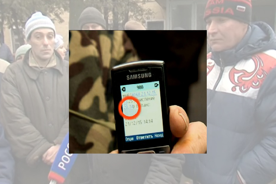Один из участников акции показал журналистам SMS на своем телефоне о начислении зарплаты за декабрь в размере 20 рублей 74 копеек.