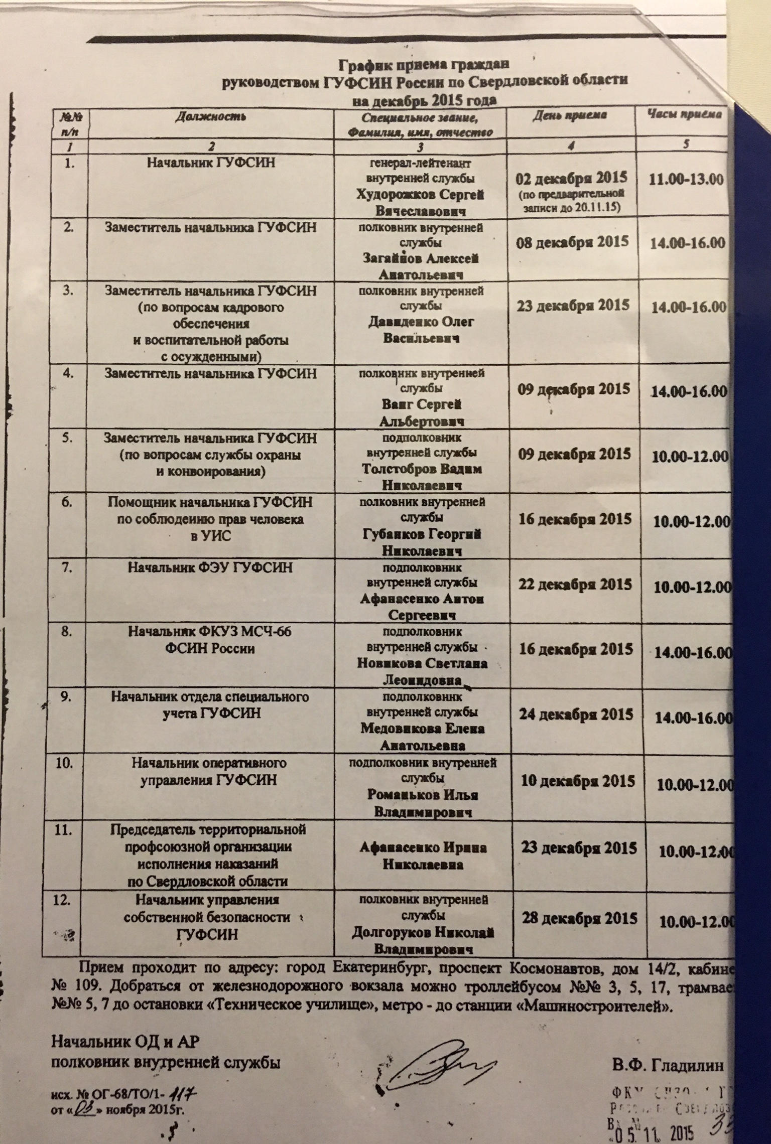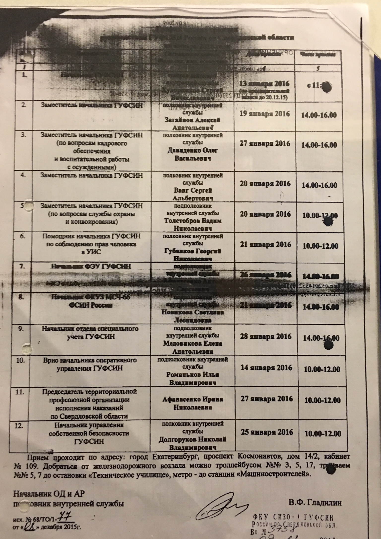 Желающие попасть на прием к руководящему составу СИЗО могут использовать приведенные мной графики (декабрь-январь). Прием родственников ведется на втором этаже помещения приема передач.