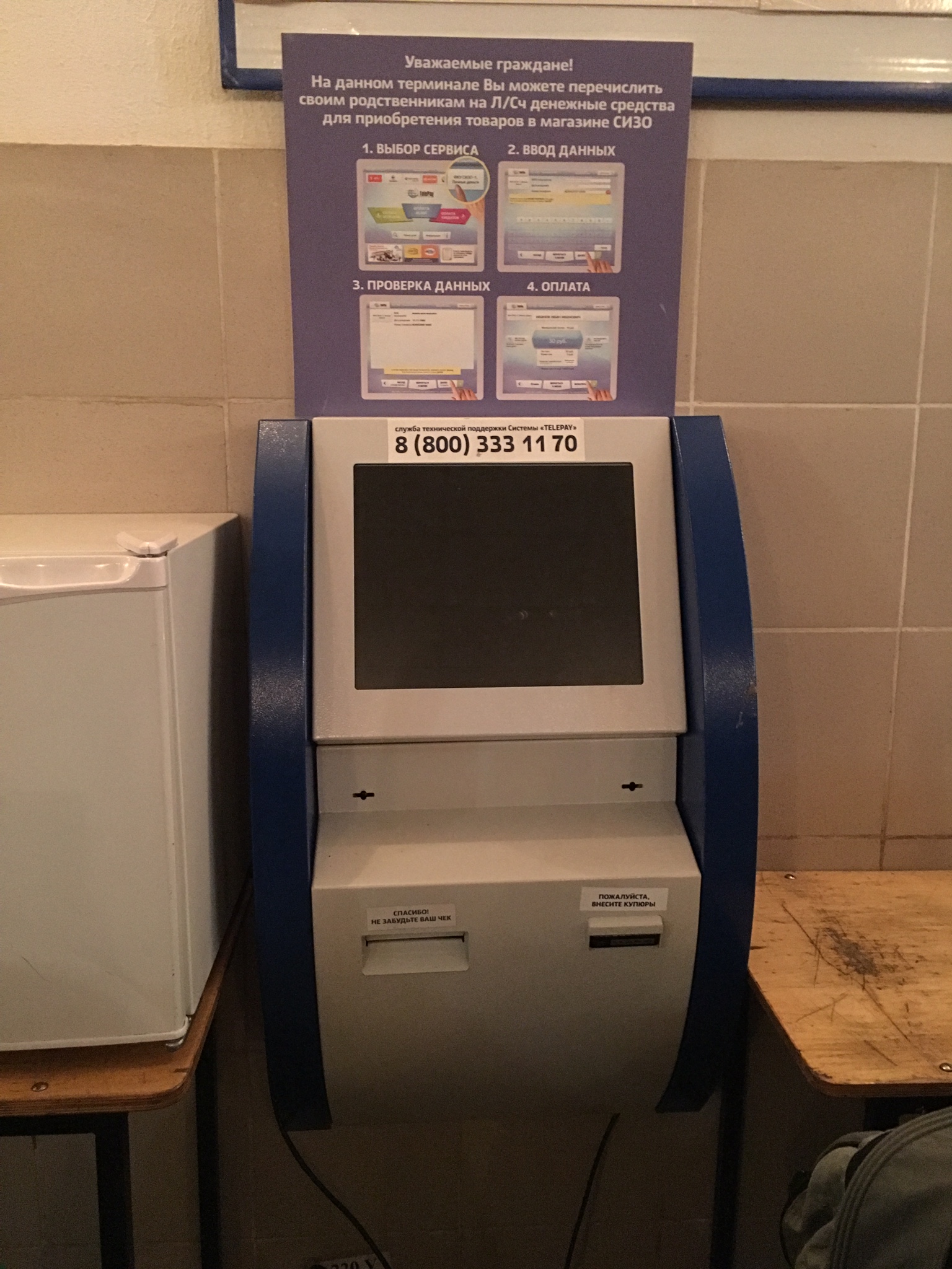 В помещении приема передач имеется терминал для зачисления средств на лицевой счет арестованного, чтобы он мог самостоятельно приобрести продукты питания и предметы первой необходимости в тюремном магазине. Терминал не работает, но есть возможность сдать деньги через кассира. Родственники должны иметь в виду, что арестованные отовариваются в магазине 2 раза в месяц (не факт, что в оставшиеся дни до праздников).