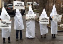Участники акции в белых балахонах с прорезями для глаз держали плакаты "Даешь православное стихосложение", "Литература - это промысел божий", "Больше пасхальности в русскую словесность".