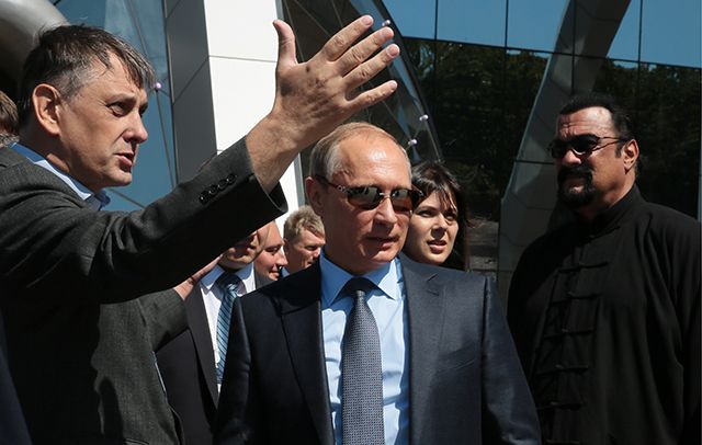 Фото: Михаил Метцель / ТАСС / Scanpix Владимир Путин и Стивен Сигал во время посещения Приморского океанариума на острове Русский. 4 сентября 2015 года