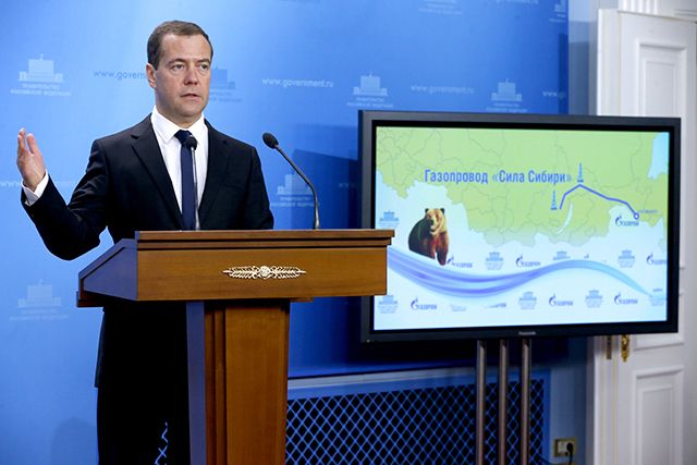 Фото: Дмитрий Астахов / пресс-служба правительства РФ / ТАСС / Scanpix Дмитрий Медведев на церемонии начала строительства китайского участка китайско-российского газопровода по восточному маршруту. 29 июня 2015 года