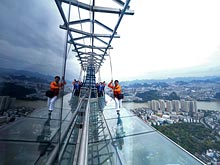 На 76-м этаже небоскреба Yunding в китайском городе Лючжоу открылся аттракцион для самых бесстрашных. Это узкий стеклянный мостик вдоль внешней стены здания, по которому можно совершить полноценную прогулку, а если позволят нервы - даже замереть на самом краю, воспарив над городом на высоте 300 метров.