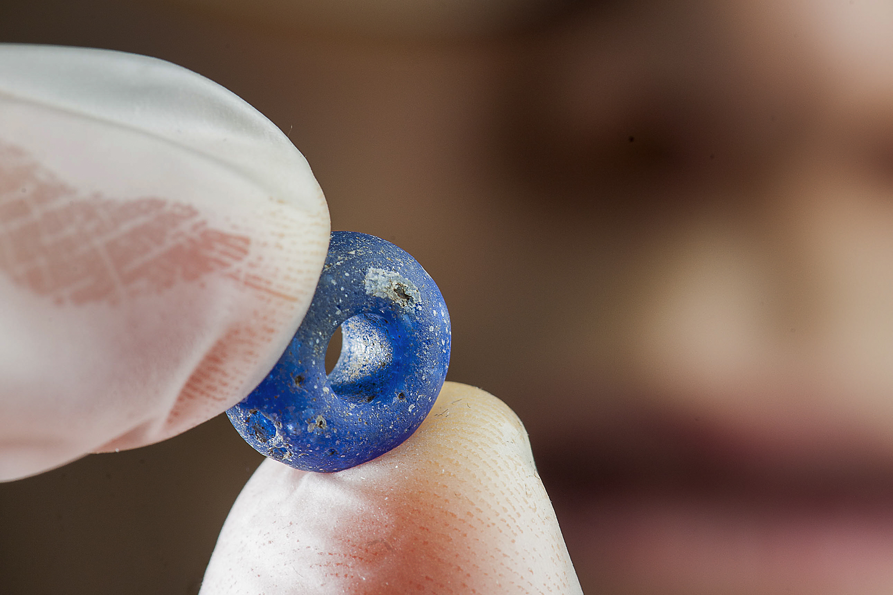 Стеклянная бусина. Фото: Åge Hojem/NTNU University Museum Кроме пищевых отходов среди древнего мусора были найдены фрагменты керамики и украшения: стеклянная бусина и несколько бусин из янтаря. Несколько осколков принадлежали кубку из зеленого стекла, изготовленному в долине Рейна. Подобные находки показывают, что местное население было достаточно состоятельным, чтобы покупать предметы роскоши.