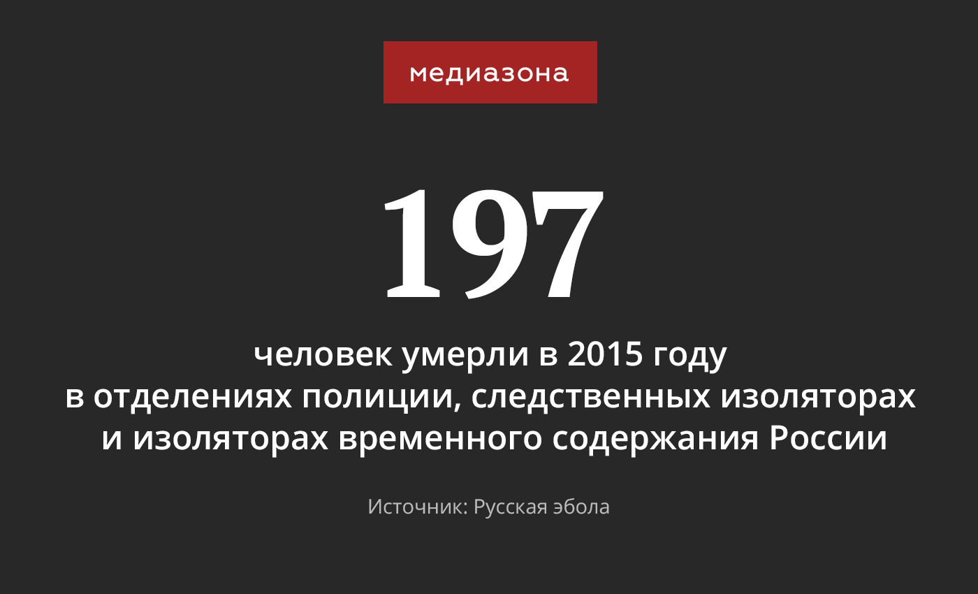 Созданный для мониторинга смертей в ОВД, СИЗО и ИВС проект «Русская эбола» подводит итоги первого года своей работы: в 2015-м России умерли 197 задержанных.