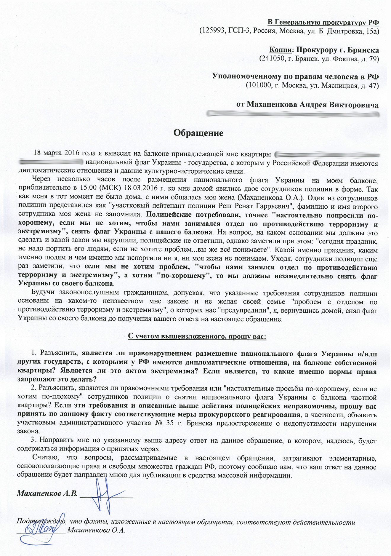Как сообщил Маханенков Открытой России, его обращение вызвано следующими обстоятельствами: «18 марта 2016 года я вывесил на балконе принадлежащей мне квартиры национальный флаг Украины — государства, с которым у Российской Федерации имеются дипломатические отношения и давние культурно-исторические связи. Через несколько часов после размещения национального флага Украины на моем балконе ко мне домой явились двое сотрудников полиции в форме. Полицейские потребовали, точнее "настоятельно попросили по-хорошему, если мы не хотим, чтобы нами занимался отдел по противодействию терроризму и экстремизму", снять флаг Украины с нашего балкона. На вопрос, на каком основании мы должны это сделать и какой закон мы нарушили, полицейские не ответили, однако заметили при этом: "Сегодня праздник, не надо портить его людям, если не хотите проблем... вы же все понимаете". Какой именно праздник, каким именно людям и чем именно мы испортили ни я, ни моя жена не понимаем. Уходя, сотрудники полиции еще раз заметили, что если мы не хотим проблем, "чтобы нами занялся отдел по противодействию терроризму и экстремизму", а хотим "по-хорошему", то мы должны незамедлительно снять флаг Украины со своего балкона.