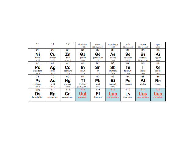 Таблица Менделеева пополнилась четырьмя элементами с 113-м, 115-м, 117-м и 118-м атомными номерами, сообщает РИА "Новости" со ссылкой на сайт Международного союза теоретической и прикладной химии. Элементам присвоены временные названия, а постоянные появятся в таблице через пять месяцев.
