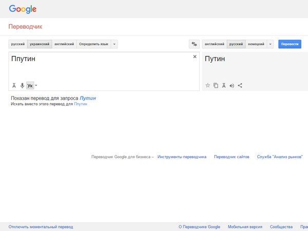 Опечатка в фамилии Путин Фото: скриншот страницы Google Translate В августе 2015 года Google Translate уличили в другом политизированном переводе. Украинское словосочетание «революція гідності» («революция достоинства») на русский язык сервис переводил как «политический кризис на Украине».