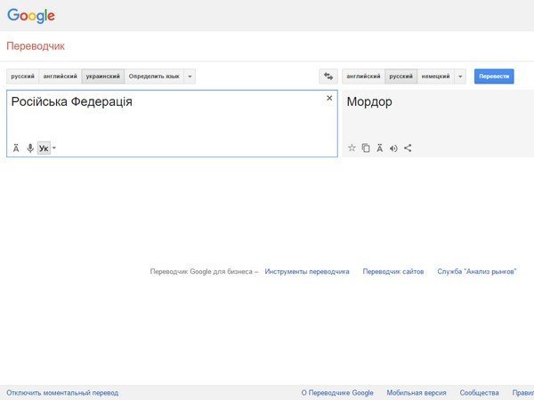 Сервис автоматического перевода Google Translate стал переводить словосочетание «Російська Федерація» («Российская Федерация») с украинского на русский как «Мордор». На это обратили внимание украинские СМИ, в частности, телеканал «112 Украина».