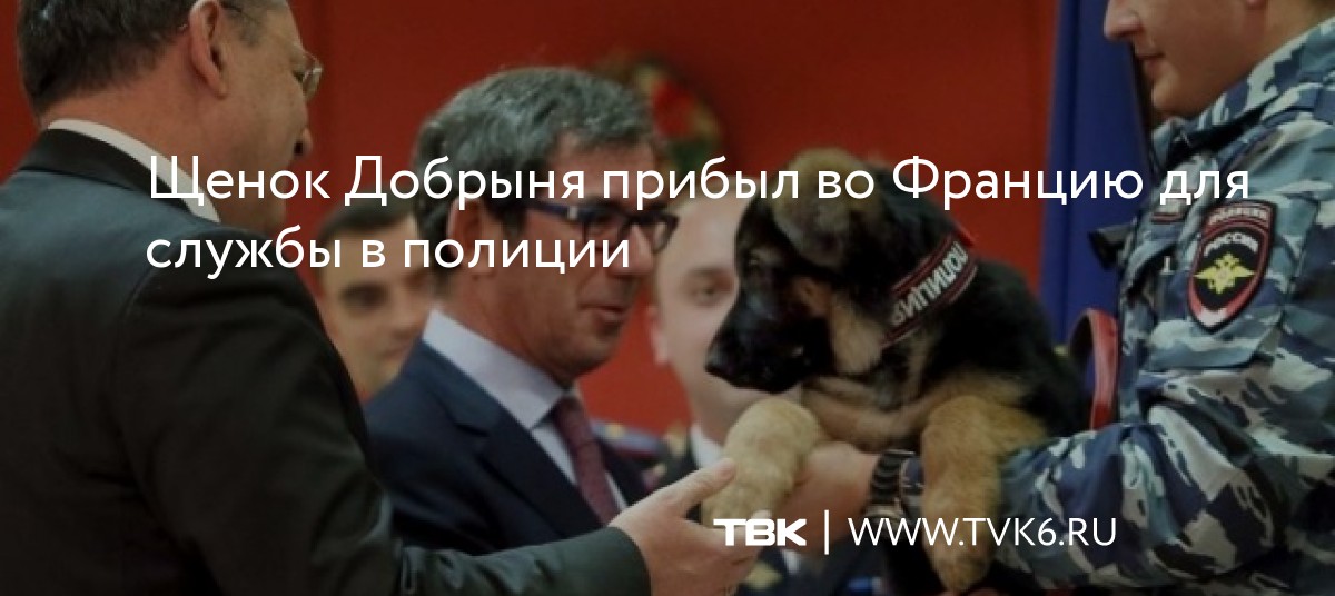 «Щенок Добрыня, подаренный российскими полицейскими-кинологами французским коллегам, прилетел сегодня во Францию. Карантинный период у Добрыни пройден, все прививки щенку сделаны, и сегодня служебного пса французские полицейские встретили в аэропорту Шарль де Голь.