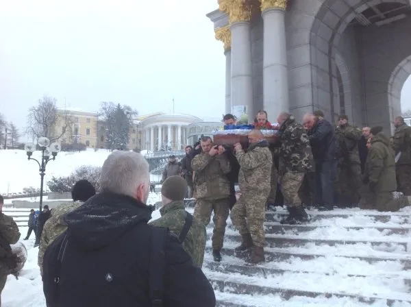 Люди идут от метро. Вырастает очередь человек в триста. Многие плачут. Иные задерживаются на панихиде лишь на минуту: первый рабочий день после череды праздников. Остальные создают живой коридор. Здесь, у стелы, обычно собирают вече и просто стихийные митинги. Видимо, с последнего сбора на белых колоннах остались портреты политиков, сделавших себе имя в дни Майдана, и рукописный плакат «Вор у вора булаву украл». О похоронах большинство узнало из теленовостей и социальных сетей.