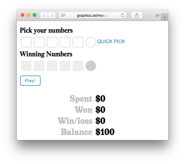 Газета Los Angeles Times сделала упрощенный симулятор игры в Powerball — проходящую в США лотерею, джекпот в которой уже достиг полутора миллиарда долларов.