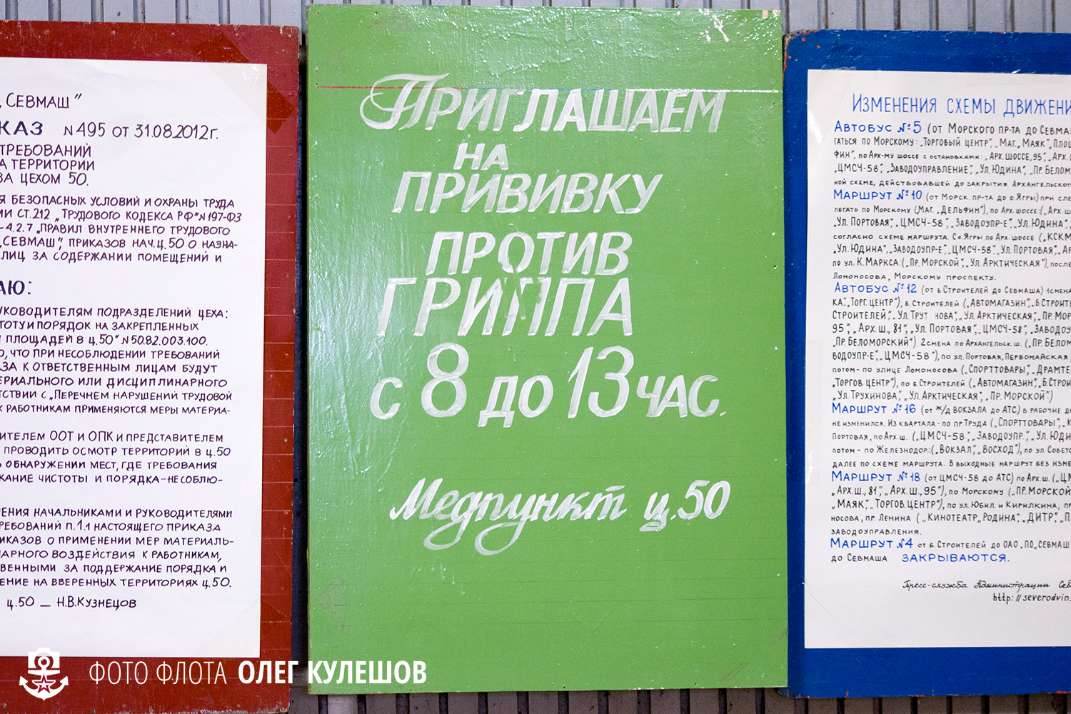 Практически все заводы Советского Союза, на которых велось производство, были в обилии увешаны рисованными плакатами по технике безопасности. Но наступил 21 век, с каждым годом таких предприятий становится все меньше и меньше, и постепенно такие плакаты уходят в историю, либо заменяются современными. Но северодвинское, наверное, всем уже знакомое предприятие "Севмаш", которое является единственным в России производителем атомных подводных лодок, поддерживает эту традицию.