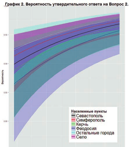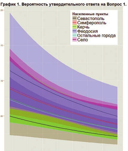Во-первых, проживание респондентов в городах или сельской местности не оказывает какого-либо статистически значимого влияния на ответы респондентов. При этом существует незначительная вариация в утвердительных ответах на вопросы между различными населенными пунктами: жители Феодосии и сельской местности ратуют за заключение контракта с Украиной, когда как жители Севастополя менее склонны к заключению контракта (см. график 1).