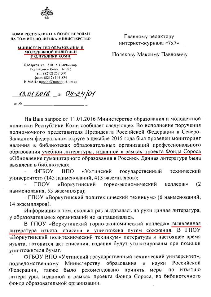 Об истории со сжиганием библиотечных книг рассказал местный портал "7х7", который направил официальный запрос в Министерство образования и молодежной политики Республики Коми. По данным воркутинских журналистов, книги, изданные при поддержке Фонда Сороса в рамках программы "Обновление гуманитарного образования в России", изымают из библиотек и учебных заведений Республики Коми с декабря 2015 года.