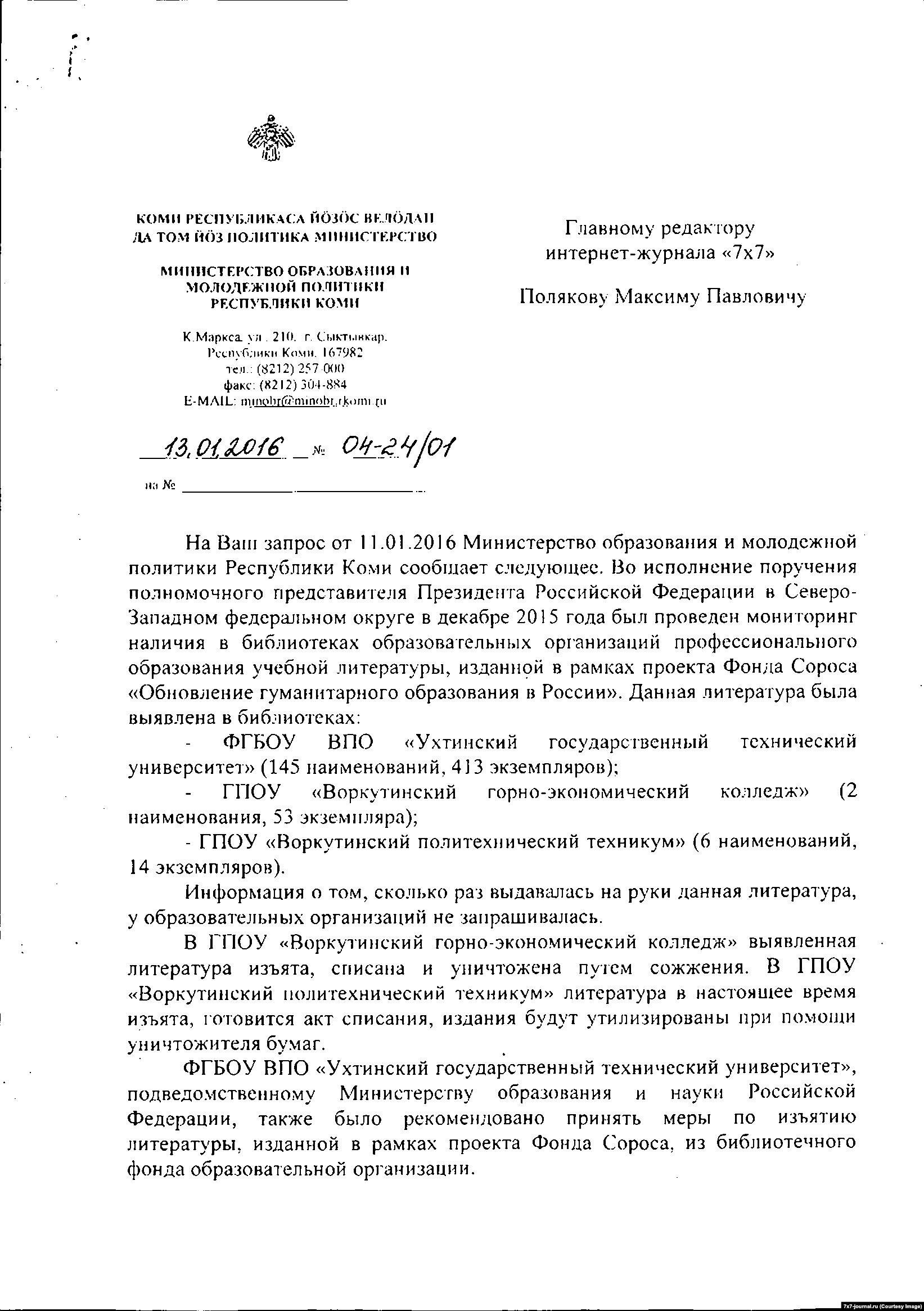 В среду редакция интернет-журнала "7x7" сообщила, что в ответ на свой запрос об изъятии с середины декабря книг, изданных при поддержке Фонда Сороса, получила письмо за подписью и.о. министра образования и молодежной политики Коми Светланы Моисеевой-Архиповой.