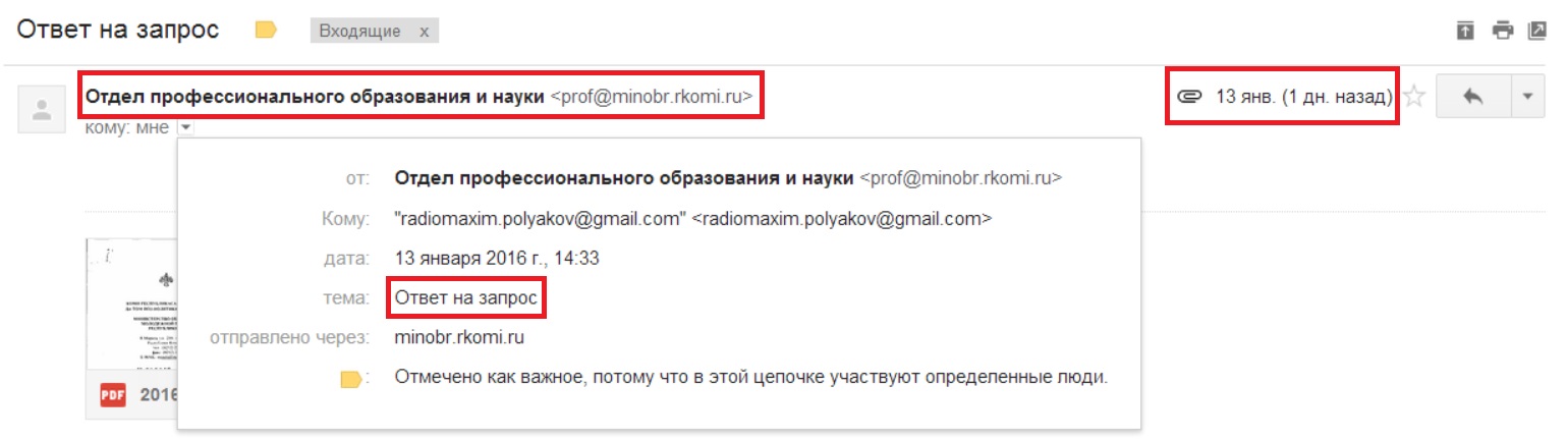 «7x7» публикует скриншот почтового ящика главного редактора интернет-издания, на который пришел ответ Минобра Коми из отдела профессионального образования.