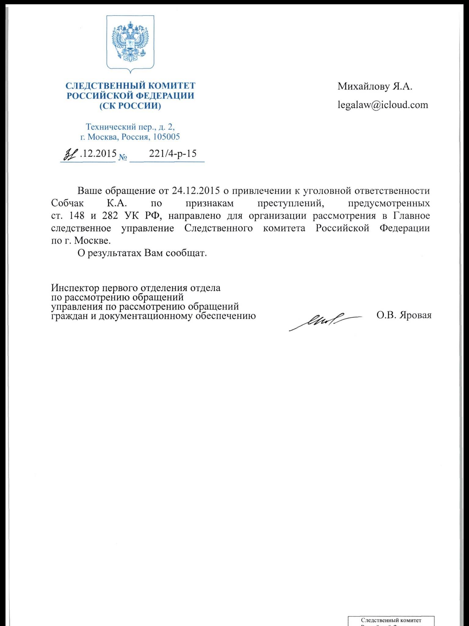 ГСУ СК России по городу - Герою Москве начало доследственную проверку в отношении К. А. Собчак по признакам преступлений, предусмотренных статьями 148 и 282 УК РФ за её циничный пост про о. Всеволода ( Чаплина), а также за изображение Собчак виде Богородицы на футболке, дизайнером которой выступила гр. Добрякова из Женского журнала Ксении Анатольевны SNC.