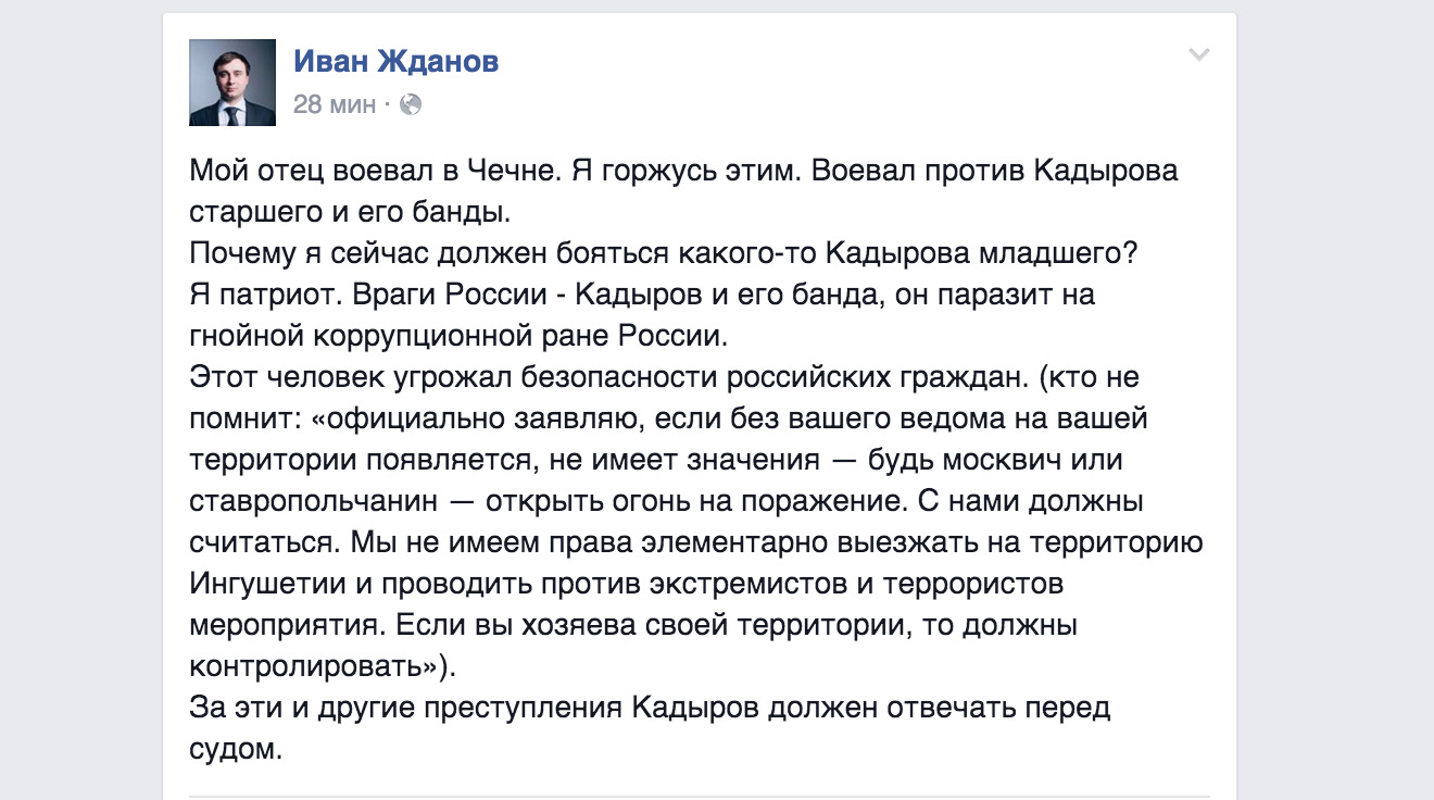 «На самом деле, мне абсолютно все равно, будет такая реакция или нет. Я пост написал прежде всего для себя и для своих друзей. Вчера, когда я обсуждал со своими знакомыми эту позицию Рамзана Кадырова, когда он обвинил всех оппозиционеров и объявил их врагами народа, я у очень многих слышал в голосе страх. Люди боятся, не понимают, как им жить дальше, уезжать из страны, не уезжать. И именно поэтому я взял на себя эту роль и публично сказал то, о чем многие люди думают, но боятся сказать публично».