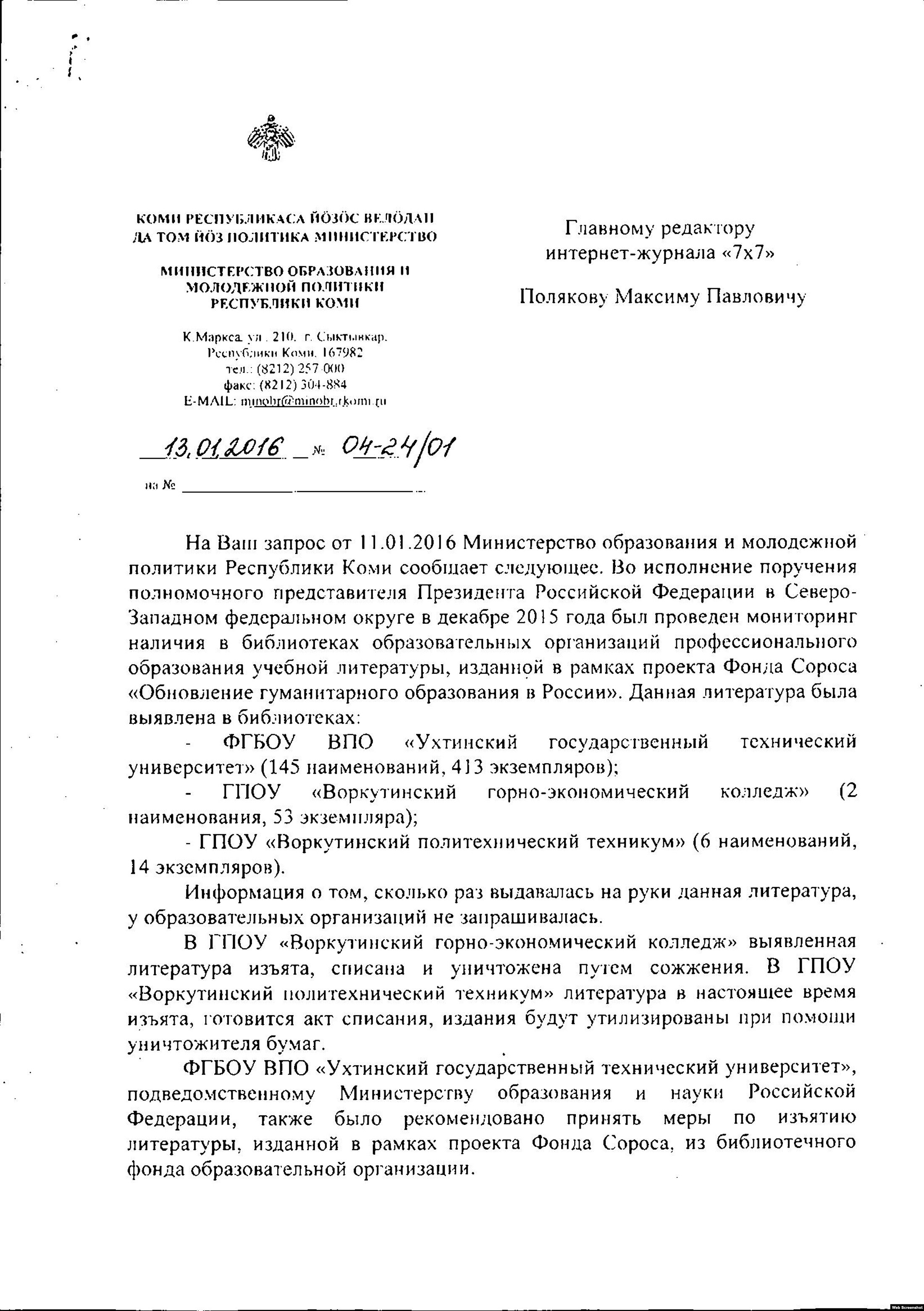 13 января стало известно, что в Республике Коми сожгли 53 книги, изданные при поддержке Фонда Сороса по проекту "Обновление гуманитарного образования в России", которые находились в библиотечном фонде Воркутинского горно-экономического колледжа. И.о. министра образования Коми Светлана Моисеева-Архипова, в ответ на запрос СМИ, подтвердила, что в нескольких вузах книги изымаются и готовятся к утилизации. 14 января в министерстве образования опровергли уничтожение книг, заявив, что их лишь изъяли.