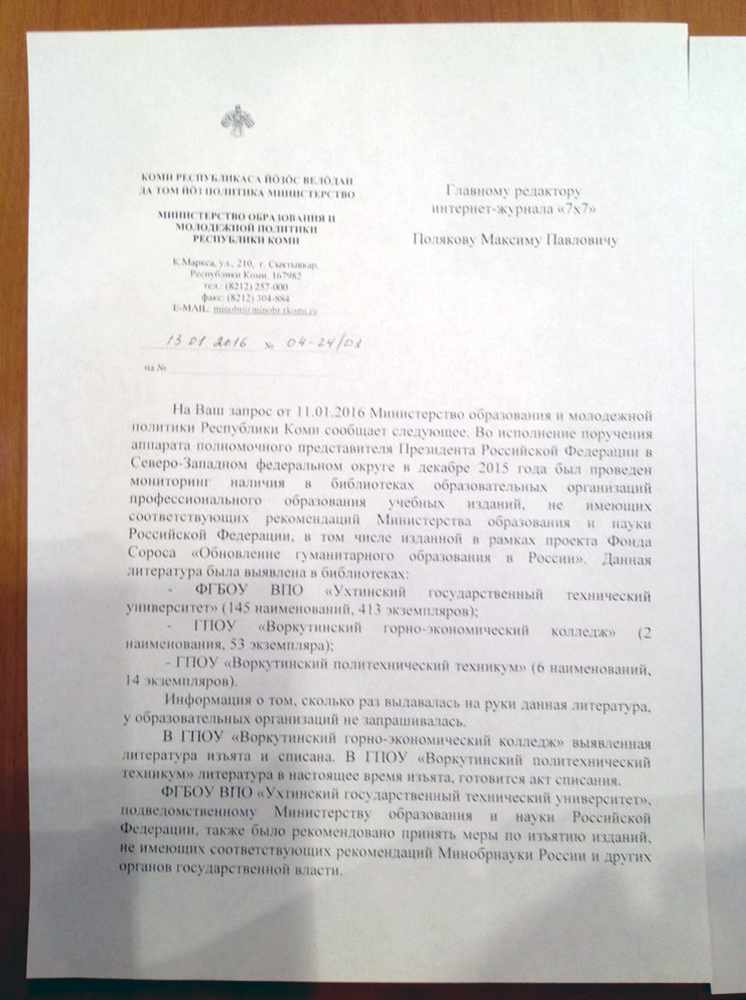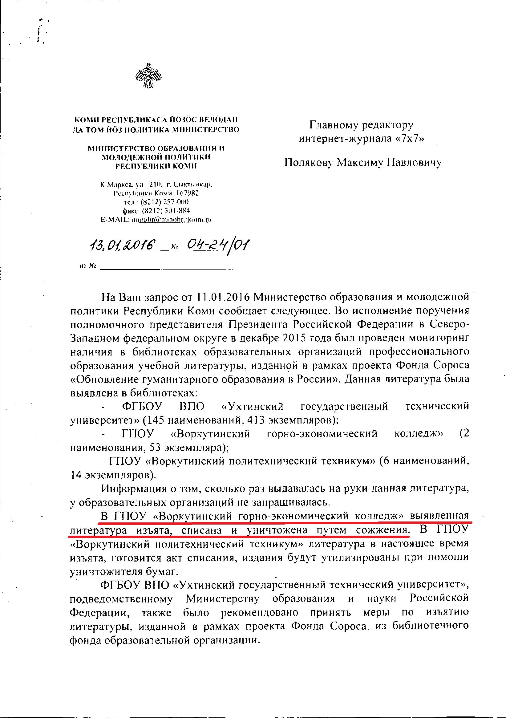 После этого интернет-журнал «7x7» направил в Минобраз запрос с просьбой прокомментировать ситуацию. В официальном ответе говорилось, что книги в воркутинском колледже были действительно обнаружены (названия и количество экземпляров совпадают) и сожжены. Редакция «7x7» приложила скан ответа от министерства, в котором есть фраза «В ГПОУ „Воркутинский горно-экономический колледж“ выявленная литература изъята и уничтожена путем сожжения». Всего 53 книги.