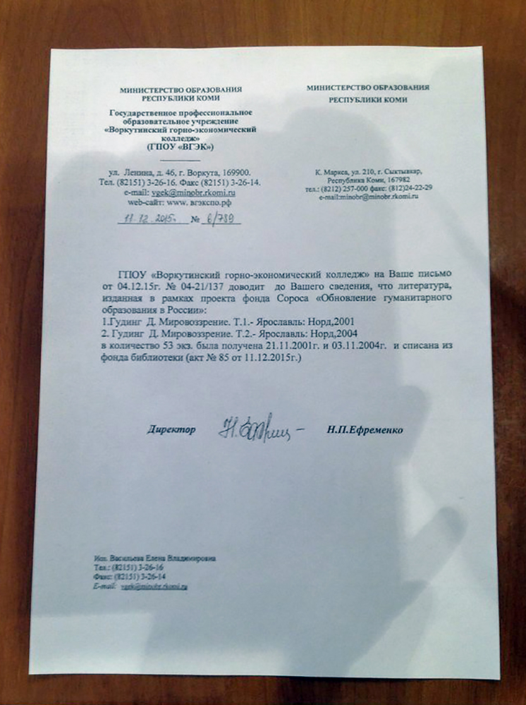 Она также сказала, что был сделан дополнительный запрос в воркутинский колледж, в ответ на который было заявлено, что книги не сжигались, а были изъяты, находятся в книгохранилище, к которому не имеют доступ пользователи.