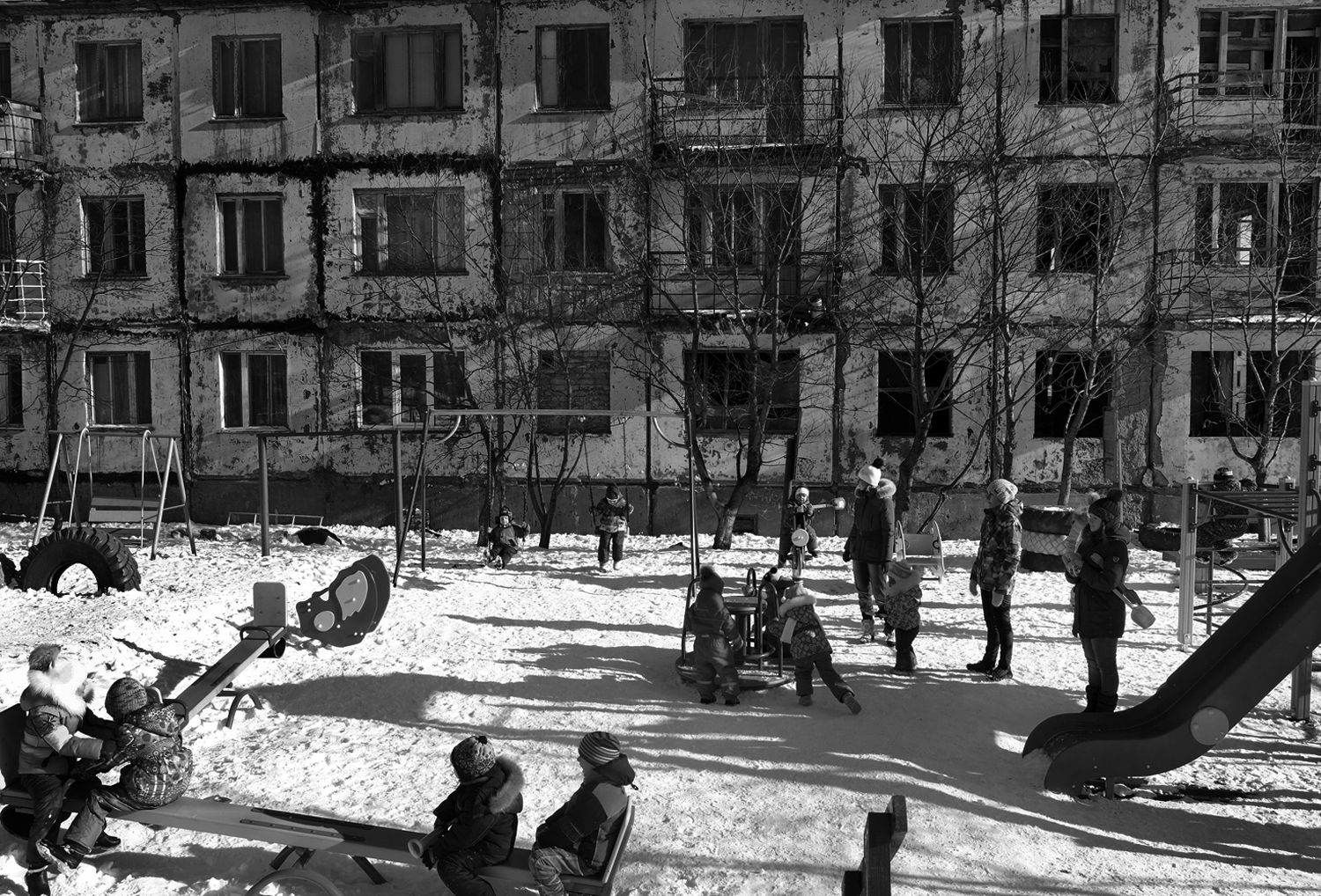 «Когда в середине 1990-х я приехал сюда лейтенантом, — рассказывает военный пенсионер в возрасте 38 лет, — то вначале подумал, что это „военный полигон“, где готовят спецназ на войну в Чечне, а не мое новое место жительства. Серьезно. Я смотрел вокруг как завороженный и думал, если здесь такой полигон, то какой же должен быть полк! Первой все поняла жена. Она заплакала». В бывшем военном городке в служебных квартирах Минобороны РФ живут в основном военные пенсионеры, действующие офицеры российской армии, их молодые жены и маленькие дети. Численность военнослужащих здесь является военной тайной, но на медицинском учете у местного фельдшера значатся 635 человек, из них — 128 детей, в том числе грудного возраста.