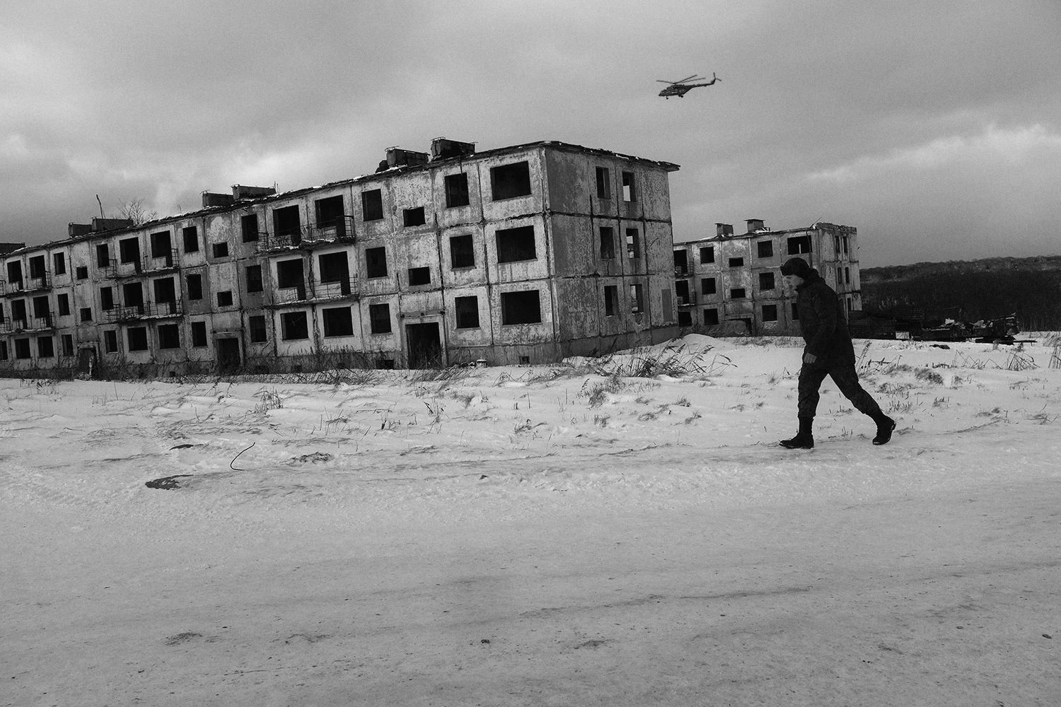 Военный городок Горное в заливе Касатка на Курильских островах был построен в начале 1980-х годов и заселен семьями военнослужащих артиллерийского, вертолетного и истребительного полков, дислоцирующихся недалеко от него. До сих пор считается, что залив Касатка на острове Итуруп — место «наиболее благоприятное для высадки десанта вероятного противника». Однако в 1990-х два полка были расформированы, часть жилого фонда и административные здания опустели и были разграблены. Землетрясение 1994 года окончательно разрушило инфраструктуру городка.