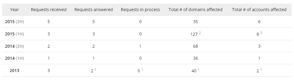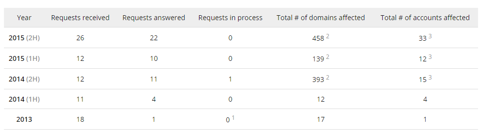 Стоит отметить существенно возросшие показатели по количеству таких запросов со стороны правоохранительных органов и суда и их воздействия на доменные имена клиентов CloudFlare по всем их видам по отношению к 2014 году: от 1,5 до 3 раз в зависимости от типа показателя