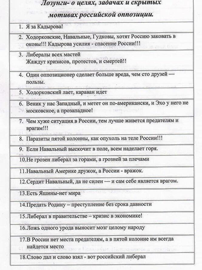 Особое внимание чиновники уделили лозунгам, которые нужно напечатать на транспарантах. В частности, предлагаются следующие варианты: «Навальный Америке дружок, а России — вражок», «Русский либерал — для России ненужный материал», «Если Навальный выскочит в поле, всем наделает горя» и «Ходорковские, Навальные, Гудковы, хотят Россию заковать в оковы!!! Кадырова усилия — спасение России!!!» (орфография и пунктуация сохранены).