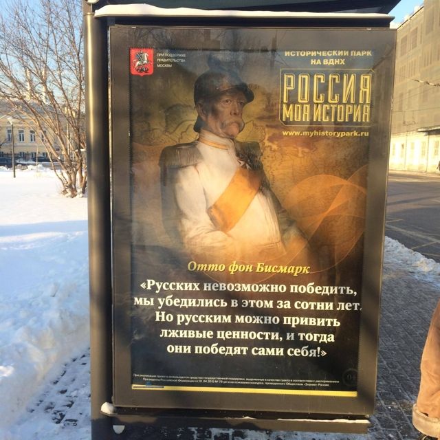 Под портретом и именем Бисмарка написано: «Русских невозможно победить, мы убедились в этом за сотни лет. Но русским можно привить лживые ценности, и тогда они победят сами себя!» В интернете очень часто приписывают эти слова «железному канцлеру», но нет никаких достоверных подтверждений того, что Бисмарк когда-либо такое говорил или писал.