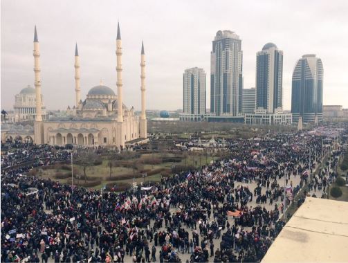 «Сегодня с 8 утра на центральную площадь Грозного начали стягиваться колонны трудящихся. Досматривают их довольно небрежно, потому что людей много, и на тщательную проверку времени просто нет.